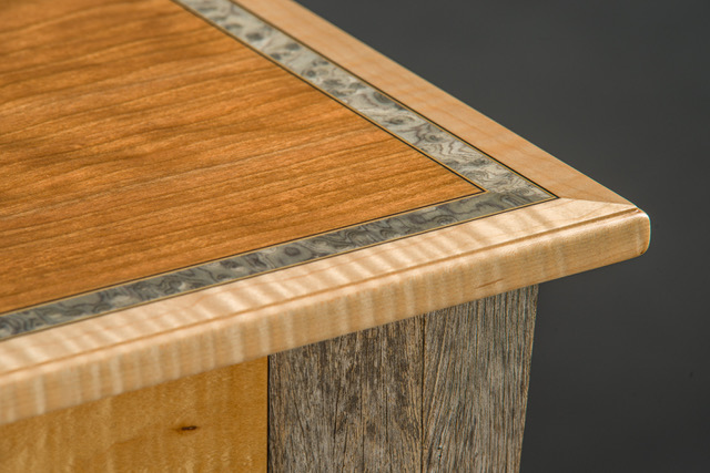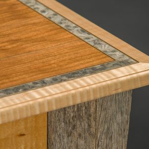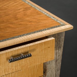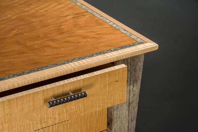 Salvaged wheelbarrow handles, Curly Maple, Wavy Cherry, Engineered grey veneer, rebar.